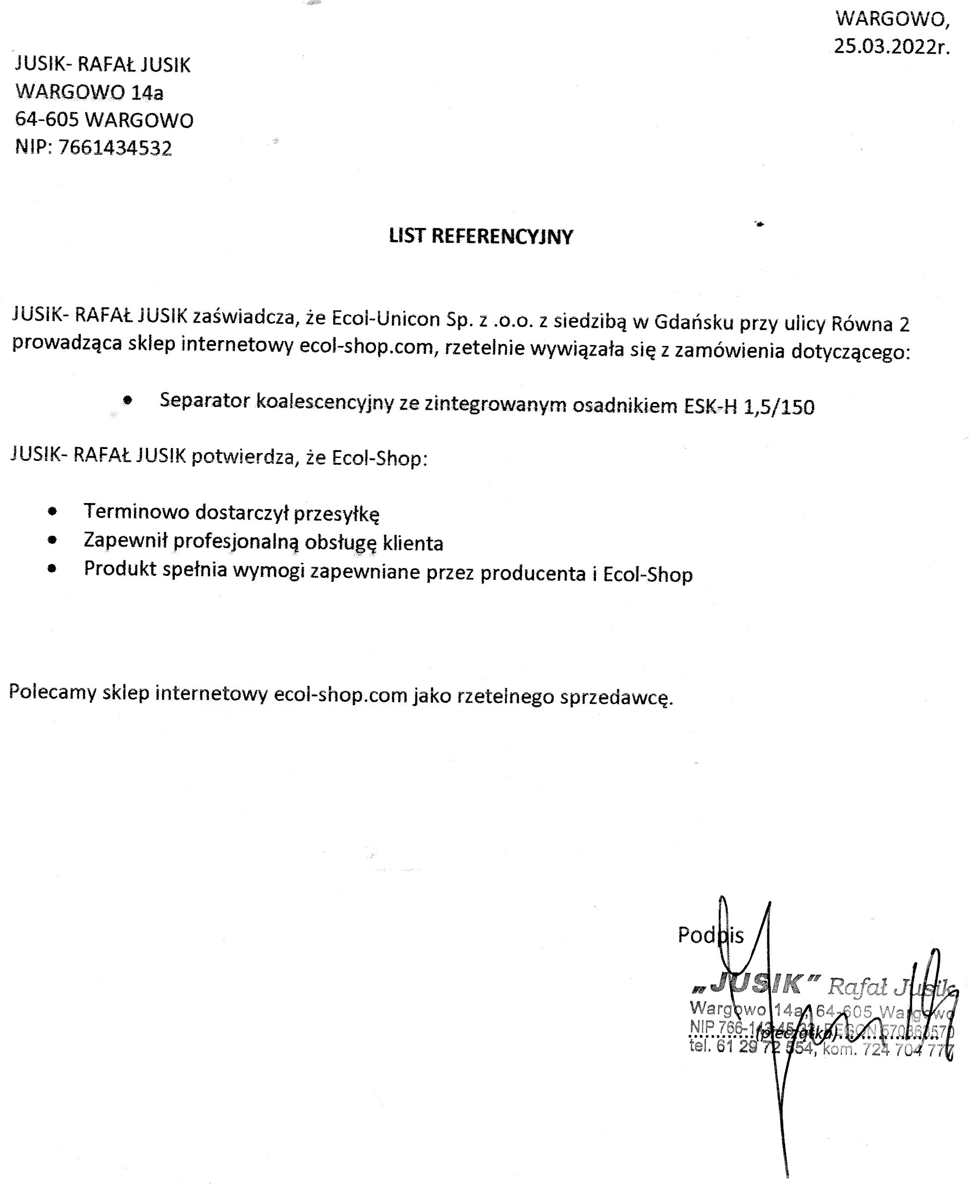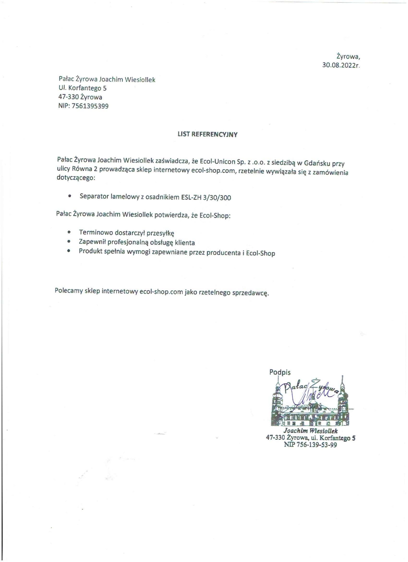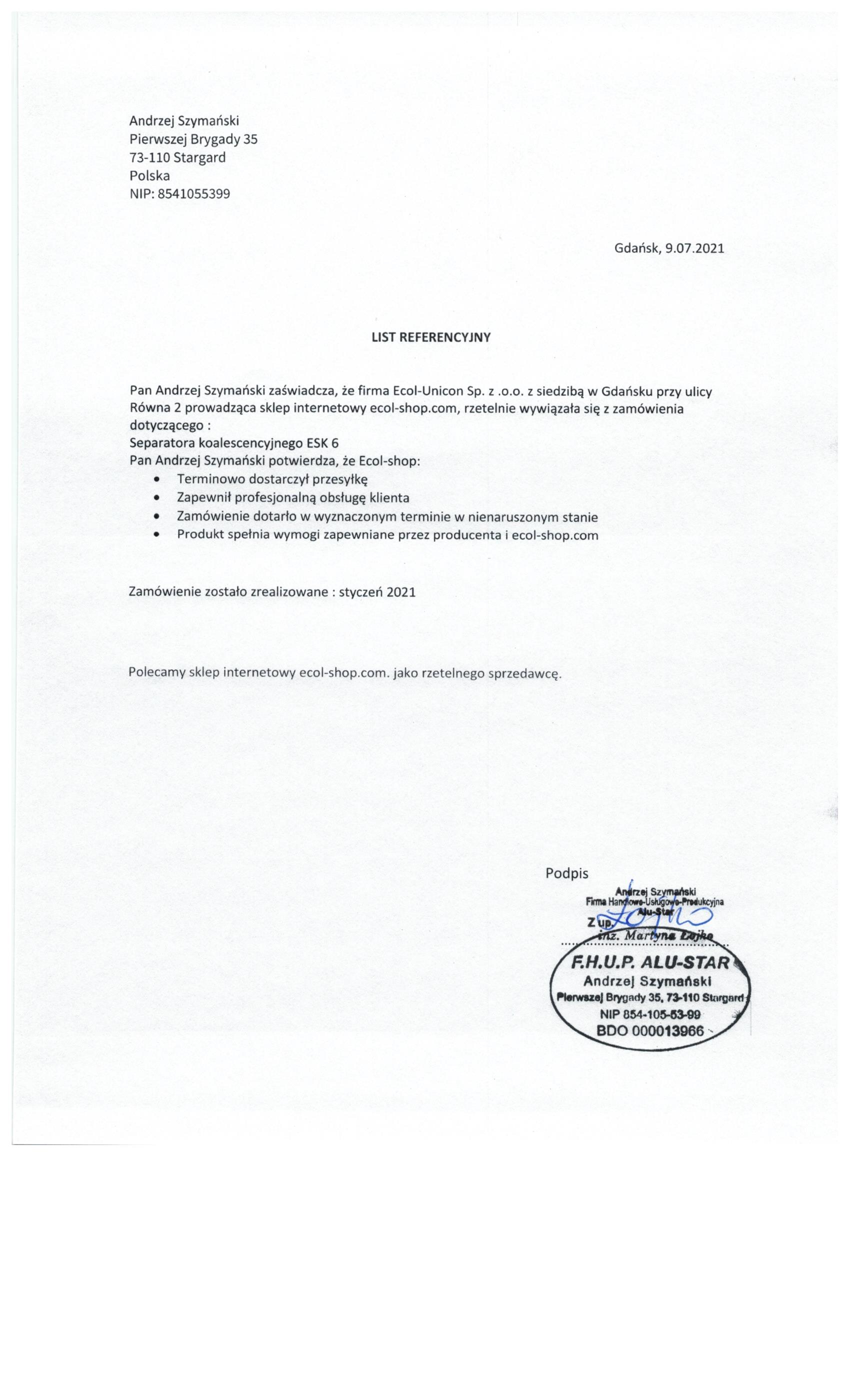 Separatory koalescencyjne ESK 3 HYDROWIT Władysław Witek ESK 6 F.H.U.P ALU‑STAR Andrzej Szymański ESK 10 Zakład Usługowo Handlowy Andmar Andrzej Dąbrowski ESK 15 PHU MAZ S.C. Zdzisław Peta, Eugeniusz Bosz ESK 15 Auto Serwis Przemysław Prais ESK 20 Zakłady Wapiennicze LHOIST S.A. ESK 20 „MELIOPOZ” WPHU Zygmunt Mieloszyk ESK 30 COM‑BUD Tomasz Skrzypczak ESK 60 Auto‑Wis Sp. z o.o. ESK‑H 1,5/150 JUSIK Rafał Jusik ESK‑H 1,5/300 Usługi Asenizacyjne Stanisław Korgól ESK‑H 3/300 DRO‑INSTAL Sp. z o.o. ESK‑H 6/600 Pegas Artur Trochimowicz ESK‑H 6/600 Global Krzysztof Sikorski ESK‑H 6/600 KRIO‑SERWIS Sp. z o.o. ESK‑H 6/1200 KONPAL Sp. z o.o. ESK‑H 10/1000 Planta Sp. z o.o. ESK‑H 10/1000 Pegas Artur Trochimowicz ESK‑H 10/1000 P.H.U. „KUCZAJ” Kuczaj Józef ESK‑H 15/1500 SPEC‑RYŚ Roboty Budowlane ESK‑H 15/3000 Przedsiębiorstwo Usług Budowlanych Broster Sp. J. ESK‑H 20/2000 Firma Ogólnobudowlana Robert Matyszczyk ESK‑H 20/2000 Hydro‑mix Pawelec Daniel Separatory lamelowe ESL‑Z 6/60 Firma Wilczek Karol Wilczek ESL‑Z 6/60 Invest Michał Stajno ESL‑ZH 3/30/300 Tadex Miękiszak Sp.J. ESL‑ZH 3/30/300 DELTA INWEST ESL‑ZH 3/30/300 Radosław Dziedziński Marad ESL‑ZH 3/30/300 Testchem Sp. z o.o. ESL‑ZH 3/30/300 Pałac Żyrowa Joachim Wiesiollek ESL‑ZH 10/100/1000 Paweł Kaczorowski ESL‑ZH 15/150/1500 BUD – GEO inż. Adam Zagalak Separatory tłuszczu EST 2 Zakład Usług Wodnych Sp. z o.o. EST 2 PULUTTECH Adam Pulut EST 2 PHU Puchałka EST 4 AQUA BUD EST‑H 2/200 F.H.U. Kubicki Jarosław EST‑H 2/200 Zakład Instalacji Sanitarnych Stok Mateusz EST‑H 4/400 KOBERLING S.C. Michał Koberling EST‑H 4/800 GODBUD Przemysław Godosz EST‑H 4/800 Telmax E.R. Gliszczyńscy EST‑H 7/700 Ditta Seria Edmund Pietrzak EST‑H 10/1000 Technika Grzewcza Andrzej Brandt Osadniki EOS‑O 1200/1,0 Adam Galstyan Multi Group EOS‑O 1200/1,0 SMR Polska Sp. z o.o. EOS‑O 1200/2,0 COM‑BUD Tomasz Skrzypczak EOS‑O 2000/5,0 INVEST Michał Stajno EOS‑O 2000/5,0 Dalkia Polska Solutions Sp. z o.o. EOW‑1 6/60 INSMONT PLUS Krzysztof Lehmann EOW‑1 15/150 Przedsiębiorstwo Robót Budowlanych MASZBUD EOW‑1 20/200 Zakład Gospodarki Komunalnej i Mieszkaniowej Wojcieszów Wkłady do separatorów Wkład ESK 6 Recto Michał Dyl Wkład ESK‑S 6 EXALO DRILLING S.A. Wkład PSKII‑V PH RESTAL Wkład WK 301 Marcin Krzemień Pakiet lamelowy PSW PHU „KARO” Pakiet lamelowy PSW MPO Sp. z o.o. Instalacje alarmowe Alarm EU‑AL‑P Hanza Grupa Inwestycyjna Sp. z o.o. Alarm EU‑AL‑R OLMAK Zbigniew Łysiak Alarm EU‑AL‑PO AKSON ELEKTRO Sp. z o.o.